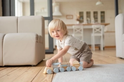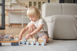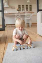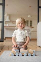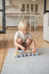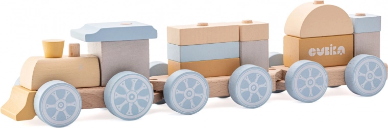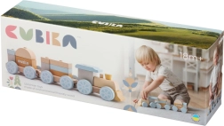 De pastel regenboogtrein van CUBIKA is een hoogwaardig houten stapelspel dat spel en leren combineert. Kinderen stapelen gekleurde blokken op de pinnen van de locomotief en de twee wagons en trainen zo handcoördinatie, kleuren en vormen. Na het samenstellen is de trein ongeveer 38 cm lang en klaar voor een fantasierijke reis.