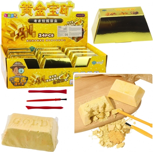 Gouden steen – opgravingen geven kinderen de spanning van ontdekkingen zoals bij een echte archeologische expeditie. In de steen zit een verrassing verstopt, die jonge onderzoekers tevoorschijn halen met de beitel, het hamertje en het kwastje in de verpakking. Op een speelse manier trainen ze zo oog-handcoördinatie en concentratie.