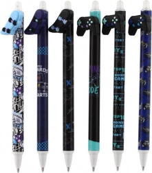 Elke pen heeft een originele topper in de vorm van een gamecontroller, skateboard, vlinderdas of vleugels en is versierd met moderne prints in een zwart‑blauw palet. Dankzij de uitgumbare inkt corrigeer je kleine foutjes eenvoudig zonder vegen.
