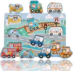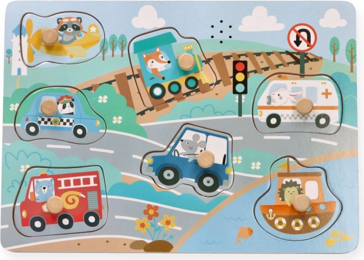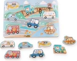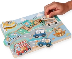 Deze interactieve houten geluidspuzzel is een uitstekende keuze om de wereld van vervoer te ontdekken. Elk stukje stelt een ander voertuig voor en bij plaatsing op de juiste plek klinkt een authentiek geluid, wat kinderen motiveert om steeds opnieuw te spelen en te leren.