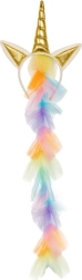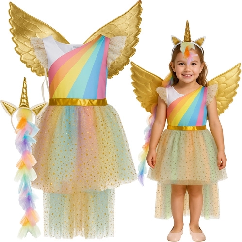 De betoverende set voor kleine fantasyliefhebbers bevat alles voor een directe transformatie – een glinsterend rokje met sterretjes, gouden vleugels met elastiek en een diadeem met oren, manen en hoorn. Dankzij het eenvoudige aantrekken over het hoofd en de elastische elementen is het kostuum snel klaar voor plezier zonder ingewikkelde sluitingen.