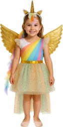 Schattig kinderkostuum eenhoorn in maat 122–128 cm tovert elke kleine prinses om tot een magisch wezen. Het omvat een rokje met een glinsterende tulelaag, gouden vleugels en een diadeem met hoorn. Het kostuum is licht en comfortabel om over het hoofd aan te trekken, ideaal voor carnaval, Halloween, feestjes en schooloptredens en kan in de wasmachine op 30 °C gewassen worden. Certificering volgens Europese normen zorgt voor veilig gebruik.