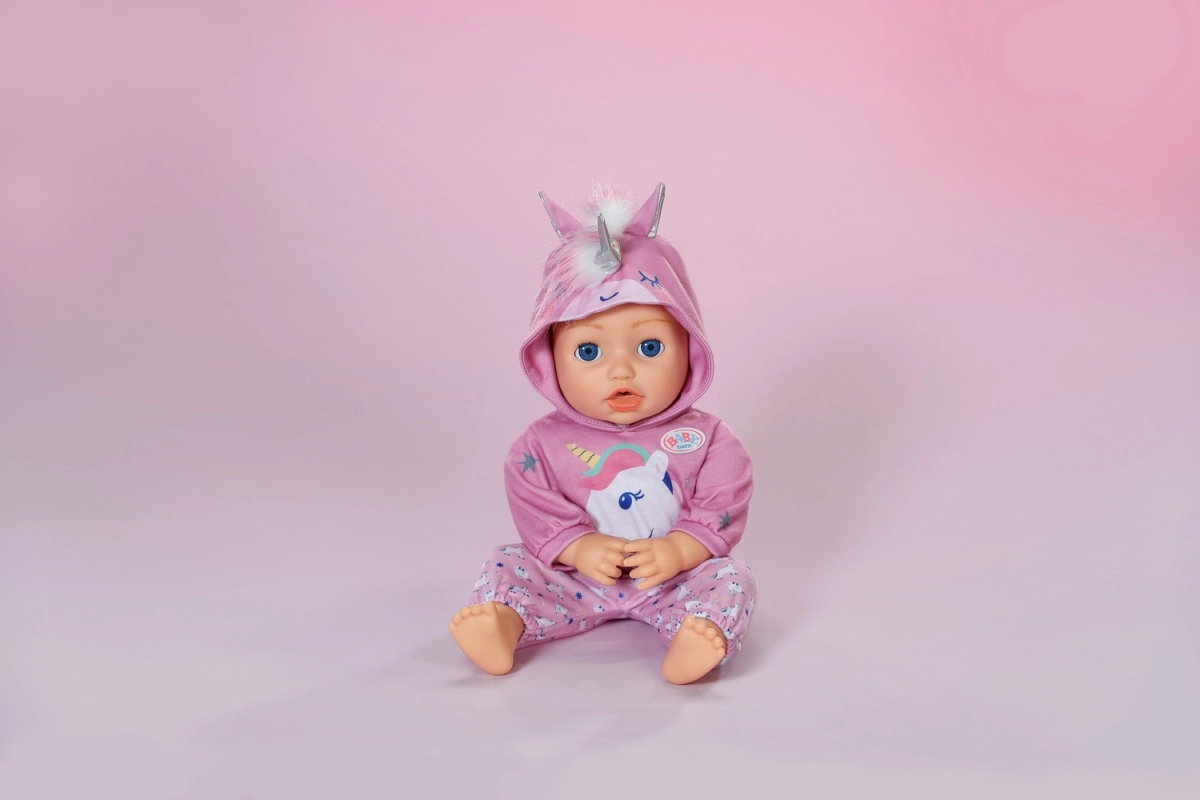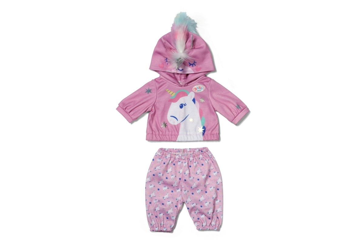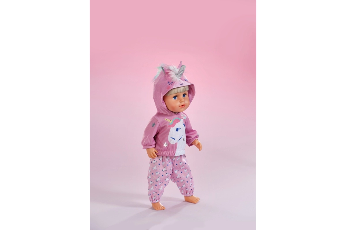 Een stijlvolle eenhoornoutfit verandert elke pop in een sprookjesachtige vriend. De zachte hoodie met capuchon met hoorn en oortjes en de bijpassende broek met eenhoornprint stimuleren creatief spel, verhalen vertellen en de fijne motoriek dankzij het eenvoudige omkleden.