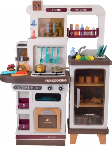 Grote kunststof kinderkeuken in zachte tinten met realistische licht- en geluidseffecten, stoom uit de brander en een werkende pompkran voor water. Deurtjes die open kunnen, beweegbare klokwijzers en rijk accessoires bevorderen creatief spel, motorische ontwikkeling en het spelenderwijs leren van huishoudelijke taken.
