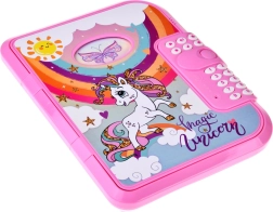 Het interactieve eenhoorndagboek is de gedroomde plek voor alle kinderige gedachten, tekeningen en geheimen. Na het invoeren van de juiste code opent het dagboek en onthult het een roze schrift, een schrijfstift en een geheime lade voor kleine schatten. Het voorste lijstje kan worden aangepast met een verwisselbare afbeelding.
