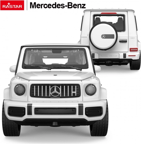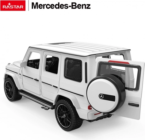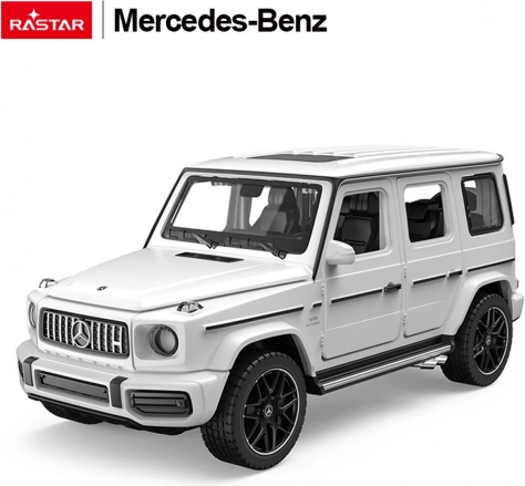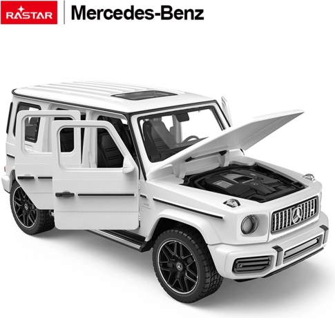Gedetailleerd uitgewerkt metalen model op schaal 1:32 van de iconische MERCEDES‑BENZ AMG G63 van het merk Rastar. Voorzien van een metalen carrosserie, rubberen banden, functionele lichten en geluiden en een te openen motorkap en zijdeuren. Inclusief voeding LR44 en certificeringen CE/EN71/RoHS.