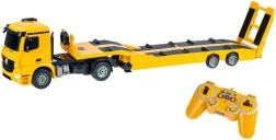 Gelicentieerde MERCEDES-BENZ trekker met plateau-oplegger voor het vervoeren van bouwmachines biedt realistische motorgeluiden, lichteffecten en volledige besturing op 2,4 GHz. Dankzij de rubberen banden en instelbare wielsporing is de rit soepel en precies. De oplegger heeft een opklapbare laadklep en verstelbare steunpoten en kan elektronisch worden aangekoppeld/losgekoppeld via de afstandsbediening.