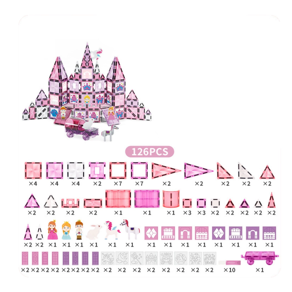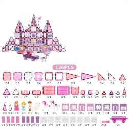 Ontdek een creatieve wereld met deze bouwset van 126 onderdelen, die magnetische verbindingen voor eenvoudig en stabiel bouwen combineert met glas-in-lood raampjes om in te kleuren. Met de meegeleverde stiften kunnen kinderen hun eigen kleurpatronen maken en zo fantasie, fijne motoriek en logisch denken ontwikkelen. De halftransparante roze blokjes zien er aantrekkelijk uit en maken van elke creatie een echte blikvanger.