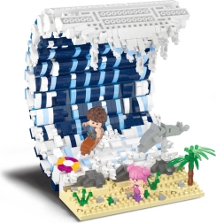 Het model combineert details zoals een krachtige watergolf, een surfer op een board, een speelse dolfijn en een zandstrand met palmboom. De twee minifiguren zorgen voor verhaal en actie in de scène – ideaal om mee te spelen of als decoratie.