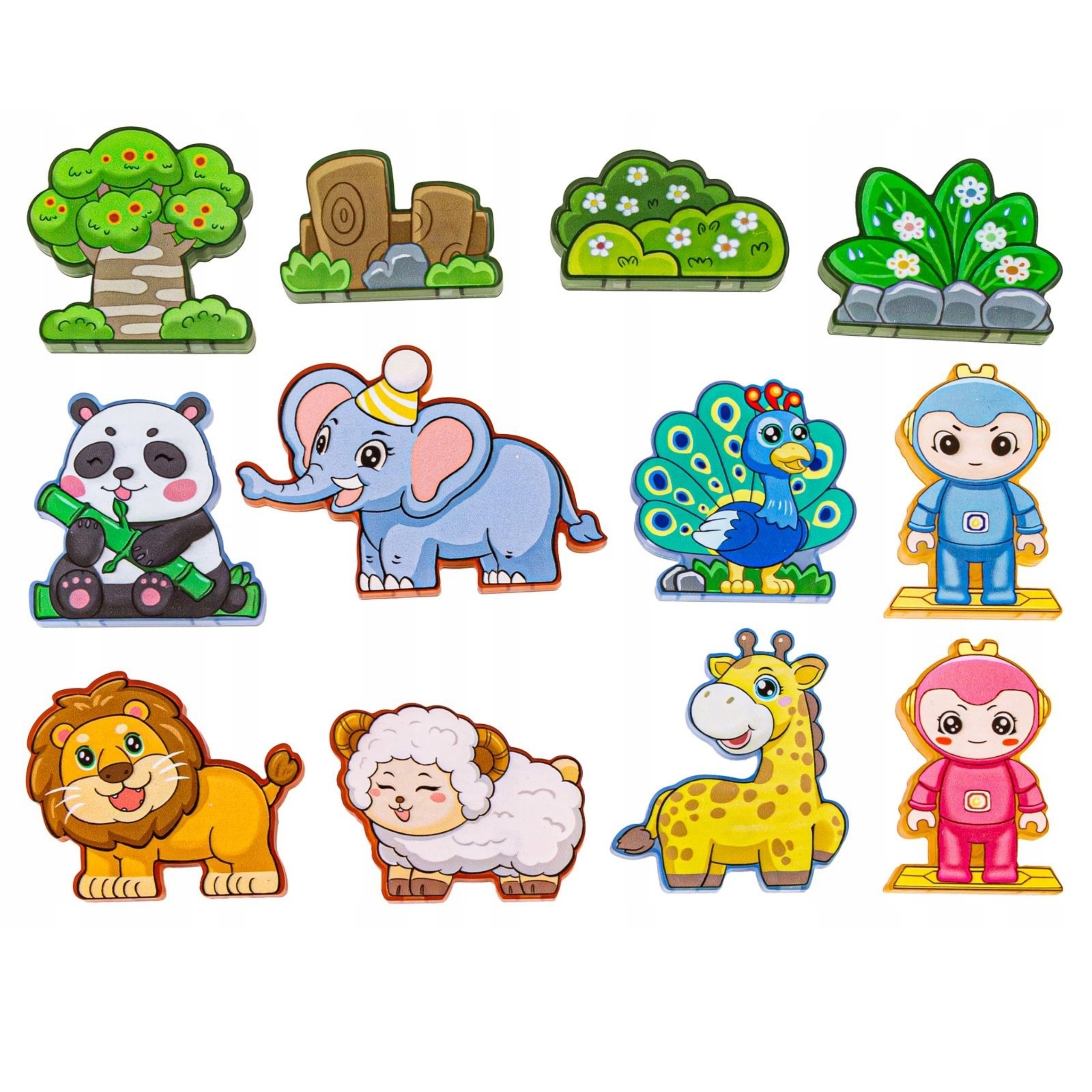 - Diverse onderdelen: magnetische vormen, dierenfiguren en personages, thematische accessoires (boom, rotsen).