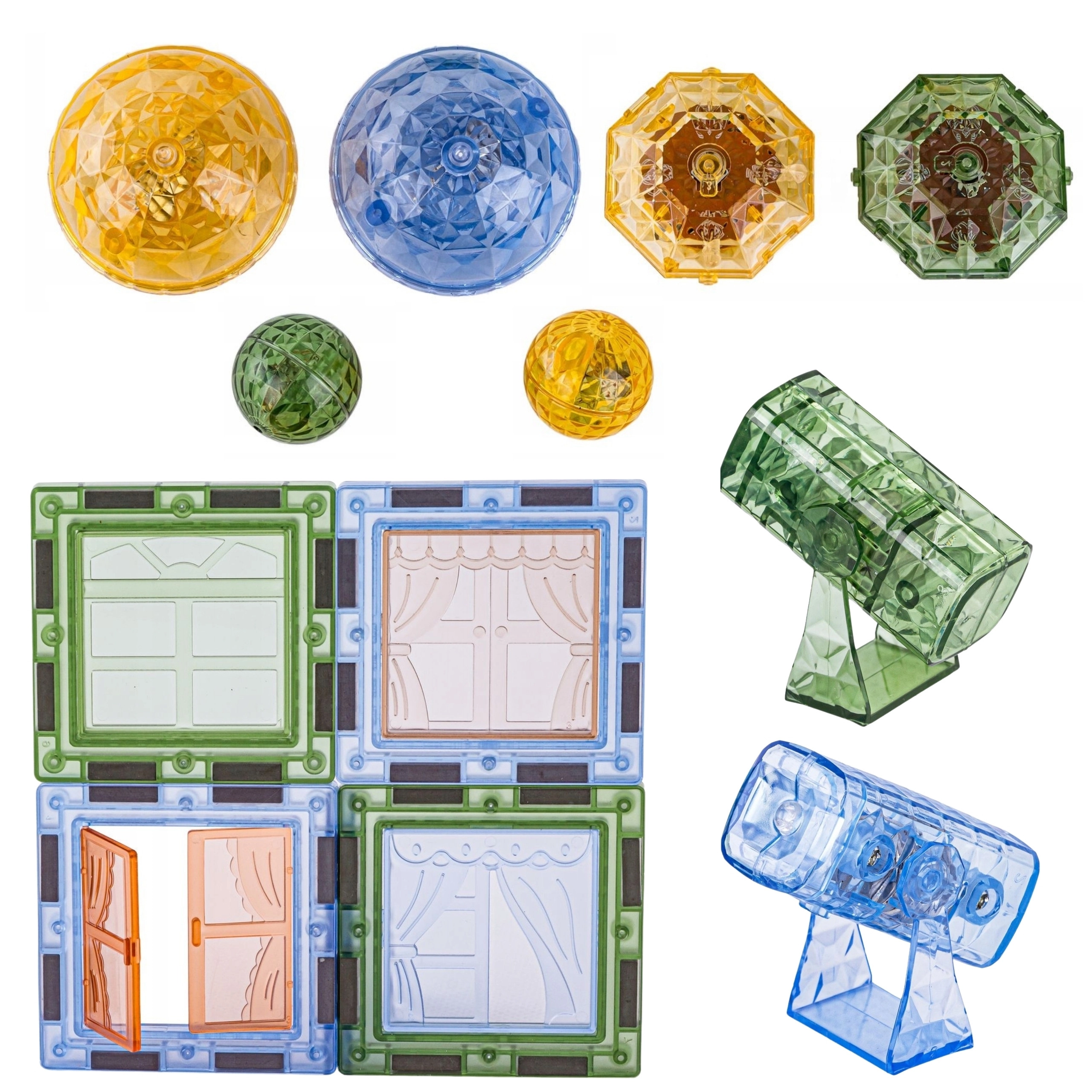 - Magnetische onderdelen in diverse vormen, dierenfiguren, personagefiguren, thematische accessoires (boom, rotsen), handleiding
