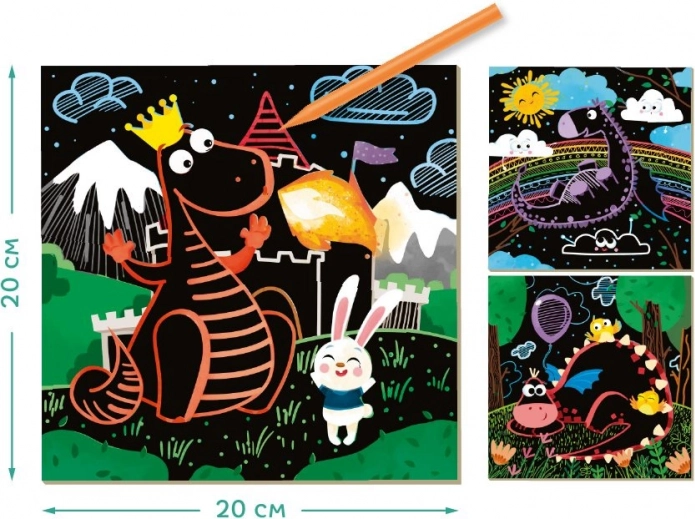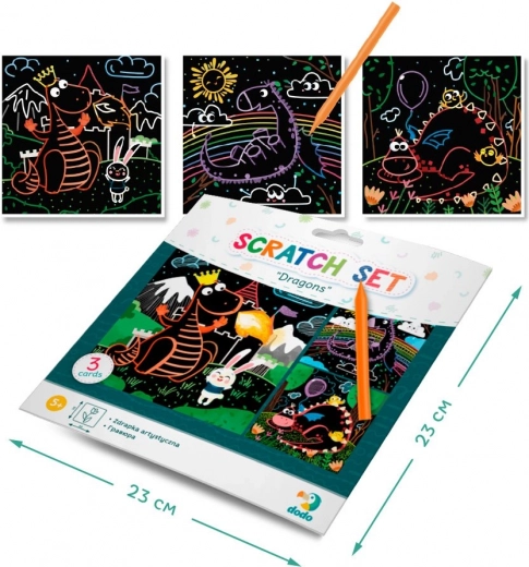 Creatieve DODO-set: 3 krasplaatjes met drakenmotief 20 × 20 cm. Ontwikkelt fijne motoriek, coördinatie en creativiteit. Inclusief kraspen.