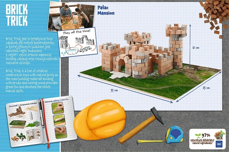 Word een bouwer en bouw je eigen kasteel XL van echte kleistenen en houten latjes. De set TREFL BRICK TRICK ontwikkelt handvaardigheid, creativiteit en concentratie en dankzij de in water oplosbare lijm kun je hem herhaaldelijk gebruiken. Volg de instructies of bedenk je eigen originele ontwerp en werk het bouwwerk af met de meegeleverde decoraties en figuurtjes.
