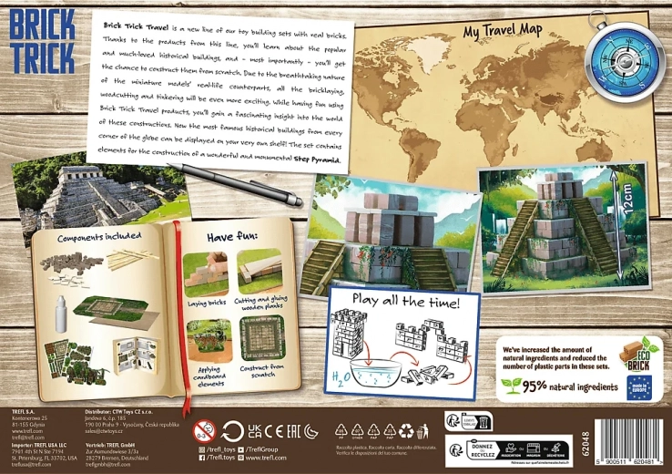 Ontdek de creatieve bouwset Trefl Brick Trick Travel: Piramide met 210 echte kleistenen en decoratieve elementen. Bouw stap voor stap volgens de handleiding of laat je fantasie de vrije loop en maak je eigen versie. De set is herbruikbaar dankzij de met water oplosbare lijm en bevordert behendigheid, verbeeldingskracht en concentratie.