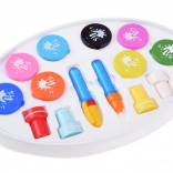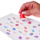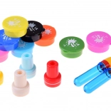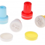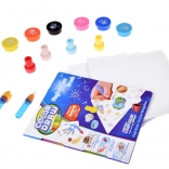 Maak originele patronen met kleurrijke stempels en opzetstukken. Kinderen maken eenvoudig decoraties, stipjes en simpele motieven.