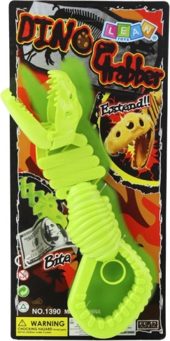 Groene grijper in de vorm van een dinosaurus-skelet. Bewegende kaken bij indrukken, duurzaam plastic, ondersteunt motoriek en coördinatie. Licht, veilig en leuk speelgoed.