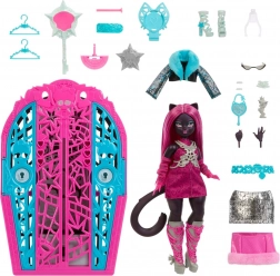 Volg het spoor naar Hauntlywood en ontdek waar Catty Noir zich verstopt! In de verpakking vind je een themakaart en een sleutel met vergrootglas die geheime symbolen onthult. Na het openen van de kledingkast wachten verrassingen om te ontgrendelen en mode-items waarmee unieke MONSTER HIGH-looks ontstaan.