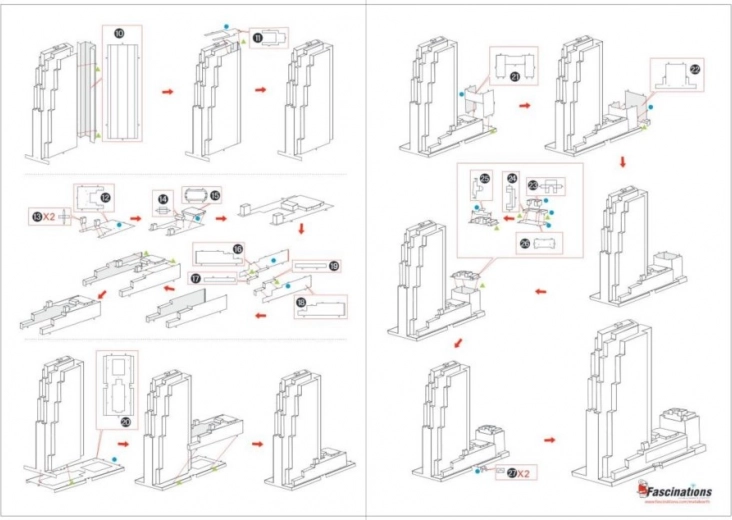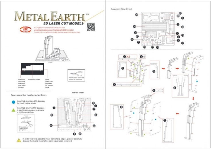 Monteren gebeurt zonder lijm: haal de onderdelen uit de plaatjes, verbind ze met behulp van slotjes en haakjes, en buig ze met kleine tangetjes voor een stevige bevestiging. Dankzij de lasergravure komen de karakteristieke details van de beroemde wolkenkrabber in Midtown Manhattan prachtig tot hun recht.