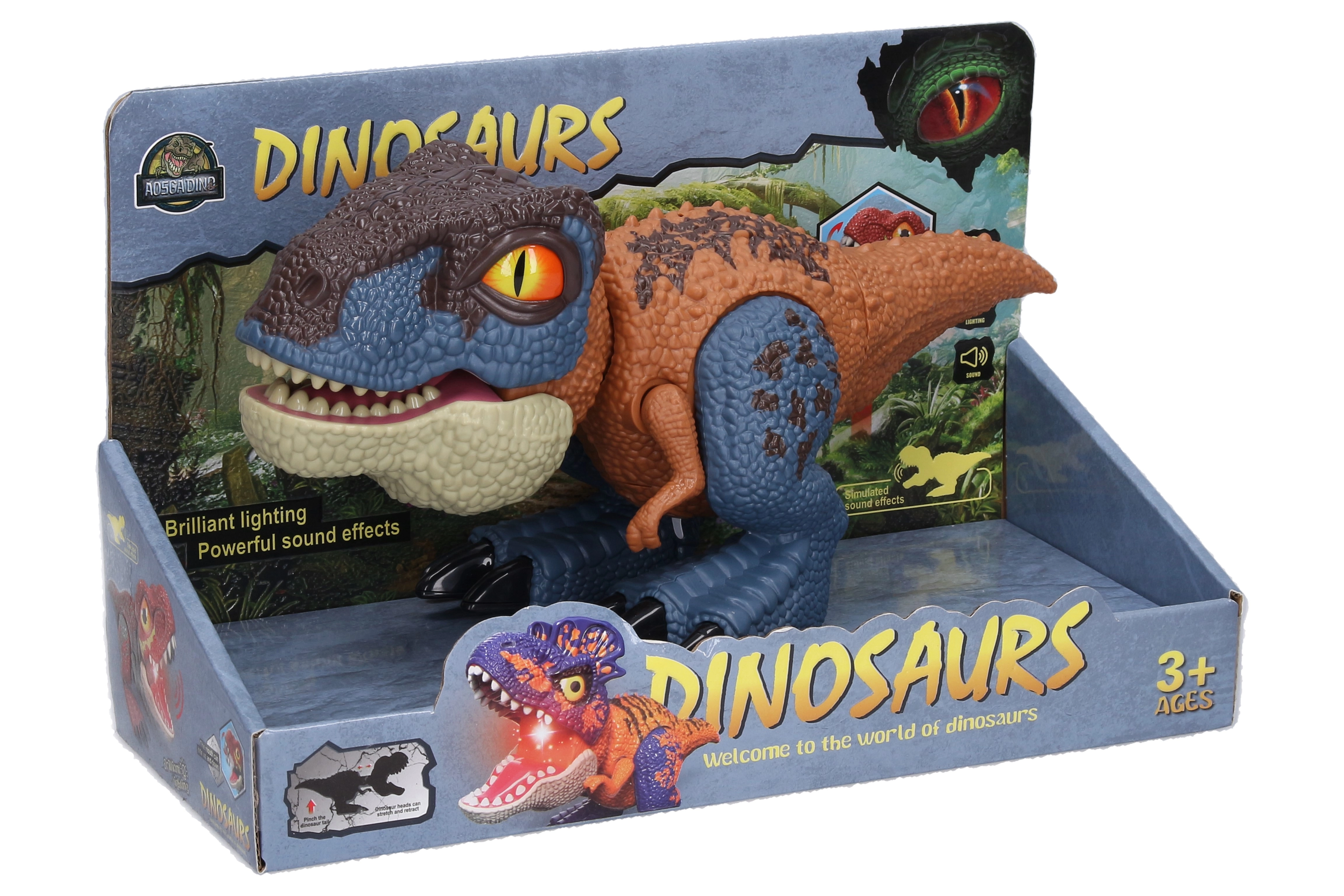 Deze gedetailleerd uitgewerkte dinosaurus in een bruine uitvoering biedt kinderen veel interactieve pret. Bij het indrukken van de knop aan de onderkant van de staart schuift de kop naar voren en gaat de bek open, vergezeld door licht- en geluidseffecten die de fantasie en het spel stimuleren.