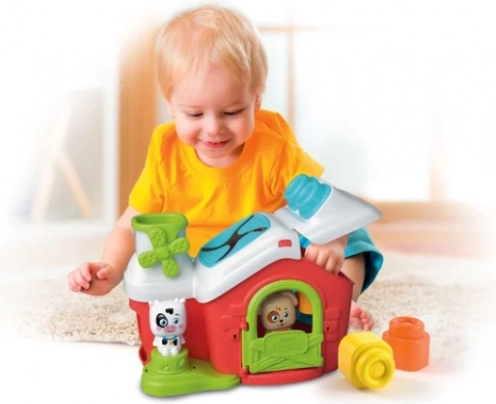 Deze interactieve boerderij uit de Clemmy-lijn biedt veilig en stimulerend spel voor peuters. Binnenin vind je veel zachte, gemakkelijk vast te houden blokken die je in de ramen en via het dak kunt stoppen. Een deel van het dak heeft een zachte inzet om blokken in te drukken, het andere deel opent voor het eenvoudig uitnemen van de blokken.