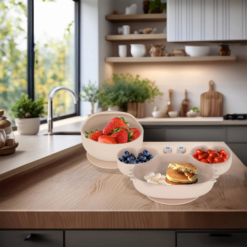 Siliconen zuignappen houden het servies stevig op tafel en besparen opruimwerk bij elke maaltijd.
