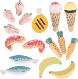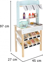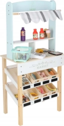 Stijlvolle houten marktkraam voor kleine verkopers die urenlang creatieve speelpret biedt. Dankzij de stevige houten constructie, 6 legplanken met mandjes, kassa, scanner en betaalkaart kunnen kinderen winkelen alsof ze in een echte supermarkt zijn. Inbegrepen is een uitgebreide set accessoires – fruit, groenten, vis, desserts en dranken, een mandje en speelgeld, die fantasie, sociale vaardigheden en fijne motoriek stimuleren.