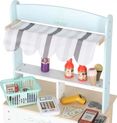 De houten kinderstand LULILO Melo is een prachtig uitgewerkt speelgoed met een stoffen luifel in zachte kleuren, waarmee de kinderkamer verandert in een kleine supermarkt. Hij biedt een stabiele MDF-constructie, praktische opbergmandjes en een overzichtelijke toonbank voor het afrekenen.