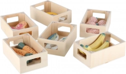- kraam met 6 planken, kassa, scanner, betaalkaart, speelgeld (bankbiljetten 5/10/25, munten 5/10/20), winkelmandje, etenswaren (garnalen ×2, aardbeien ×4, wortels ×3, vlees, vis ×2, bananen ×2, druiven- en sinaasappelsap ×2, fruitsnack, melkkoekjes, pizza, yoghurt ×2, melk, ijs ×2)