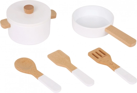 De set bevat alles wat kleine koks nodig hebben: een gouden gootsteen met kraan, een kookplaat met draaiknoppen, een oven met transparante deur, 3 houten keukengereedschappen, een handdoek, een zoutvaatje, een pepervaatje en twee pannen met deksel. Het materiaal is van 100% FSC-gecertificeerd hout voor veilig en duurzaam speelplezier.