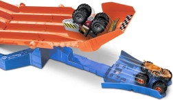 Beleef een adrenalineverhogende race met Hot Wheels Monster Trucks – de set Slooprace biedt vier rijstroken, een startpoort voor gelijktijdige starts en een willekeurige wissel die bepaalt wie de finish haalt en wie eindigt in een spectaculaire crash. Inclusief 2 trucks op schaal 1:64 (Mega‑Wrex en Tiger Shark) en uitbreidbaar met extra auto's en banen.