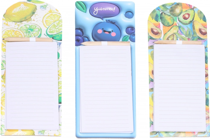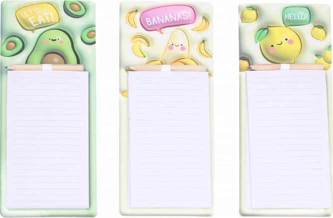 Magnetische notitieblokken met potlood, 40 gelinieerde vellen, mix van 6 fruitmotieven. Ideaal op de koelkast voor boodschappenlijstjes en berichtjes.