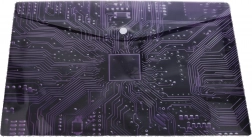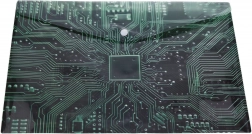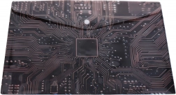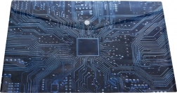 Deze elegante plastic envelop met drukknoop van 35 × 25 cm is ideaal voor dagelijks gebruik op school, kantoor en thuis. Het halftransparante materiaal met een technisch patroon geïnspireerd op een moederbord oogt modern en helpt de inhoud snel te herkennen.