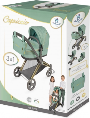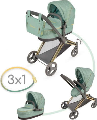 Elegante 3-in-1 poppenwagen uit de CAPRICCIO-collectie in een moderne mintgroene kleur, met een reiswieg, sportzitje en draagbare kuip. Voorzien van een verstelbare kap, zwenkbare voorwielen voor eenvoudig manoeuvreren, een opbergmand en een afneembare tas met gouden ritsen. Dankzij het opvouwbare frame neemt hij weinig ruimte in en is hij ideaal voor kinderen vanaf 3 jaar.