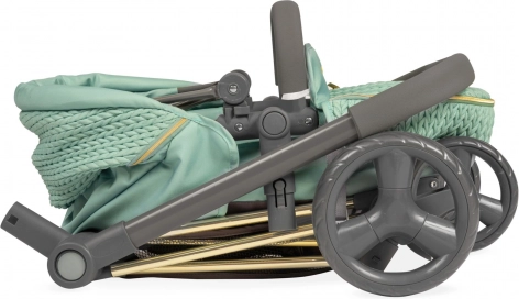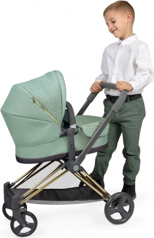 Deze stijlvolle poppenwagen valt op door de combinatie van moderne mintgroene stof en decoratieve details, waaronder gouden accenten. Dankzij het doordachte ontwerp schakelt u gemakkelijk tussen de diepe wieg en de sportstand. De hogere duwbeugel (73 cm) zorgt voor comfortabel rijden, ook voor kleuters.