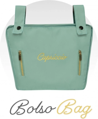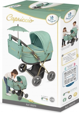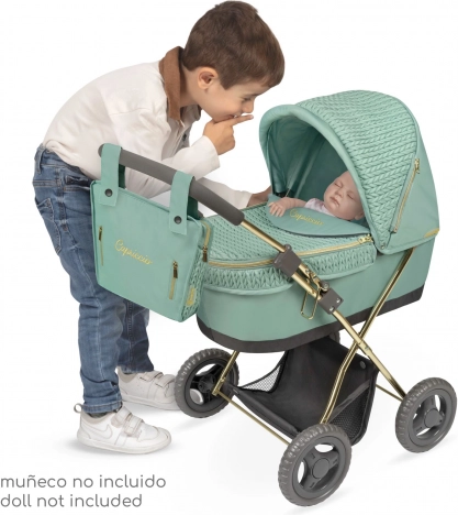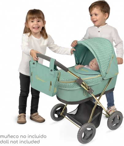 Stijlvolle poppenwagen uit de collectie Capriccio 2025 met modern design in mintgroen, laag gewicht en eenvoudige bediening. Voorzien van een opvouwbaar frame, parasol, afneembare tas met gouden ritsen, een zacht matras en een praktische opbergmand – ideaal voor jongere kinderen vanaf 3 jaar.