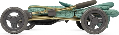 Ontdek de poppenwagen uit de Capriccio 2025-collectie met onmiskenbare mintgroene kleur en elegante gouden details. De combinatie van brei-look en gladde stof geeft de wagen een luxe uitstraling, terwijl het lichte frame en de lagere duwbeugel zorgen voor comfortabel sturen, ook voor kleinere kinderen.