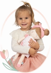 De pluchen pop Tulipe uit de nieuwe collectie 2025 valt op door een harmonisch palet van warme pasteltinten en een subtiel bloemenpatroon. Dankzij de zachte, gladde en licht glanzende pluche voelt ze prettig aan en is ze perfect voor in het bedje en op reis. Het lage gewicht en de compacte afmetingen maken het kinderen makkelijk om te hanteren en stimuleren fijne motoriek en fantasie tijdens het spelen.