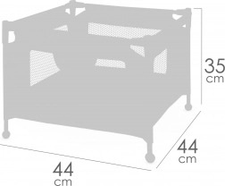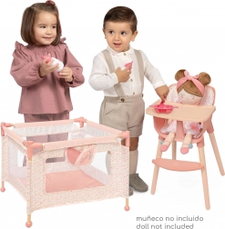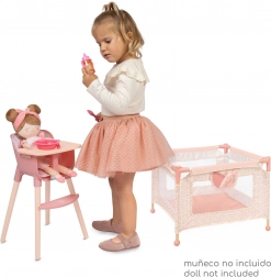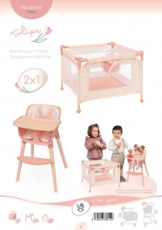 De set bevat een stevige speelbox met gaas-zijwanden en een praktische zak voor kleine spulletjes, evenals een kinderstoel met afneembaar blad en een driepuntsgordel voor het veilig plaatsen van de pop. Beide producten zijn ontworpen voor poppen tot 36 cm en blinken uit in eenvoudige bediening en onderhoud.