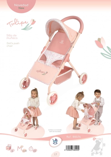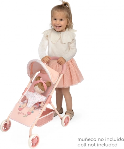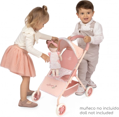 Elegante sportieve poppenwagen uit de Tulipe-collectie, opvallend door zijn Spaanse design, precisie-afwerking en eenvoudige bediening. Lichtgewicht frame met driepuntsgordel, praktische opbergmand en een duwhoogte van 55 cm, ideaal voor kleinere kinderen. De stijlvolle bloemenprint in warme pasteltinten maakt elk rollenspel compleet.