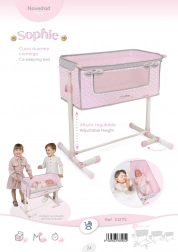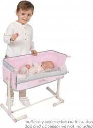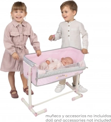 Elegant wiegje voor pasgeboren poppen uit de SOPHIE-serie met een verfijnd design en de praktische functie van samen slapen (co-sleeping). Dankzij de neerklapbare zijwand, verstelbare poten en het in hoogte verstelbare bedje schuif je het eenvoudig tegen het kinderbed. Makkelijke bediening, hoogwaardige afwerking en de zachte roze uitvoering met grijze en witte details creëren een betoverend plekje voor elke pop.