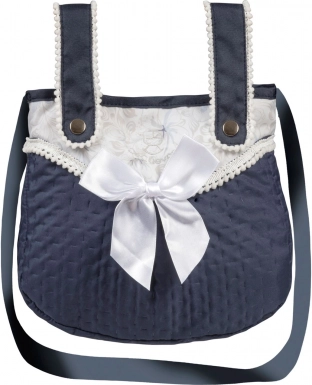 Inclusief decoratief doorgestikte tas die je aan de wagen kunt bevestigen of over de schouder kunt dragen. Uniform design in donkerblauw met witte details.