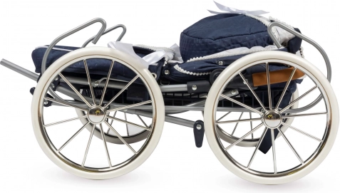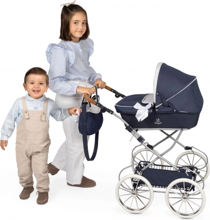 Ontdek tijdloze stijl en comfort met de DE CUEVAS Vintage 2025 poppenwagen. De combinatie van donkerblauw en ijswit met subtiele print, decoratieve strikjes en kwaliteitsmaterialen creëert een luxe retro uitstraling geïnspireerd op echte kinderwagens. Dankzij de soepele vering en zachte uitrusting is elke wandeling met de pop een plezier.