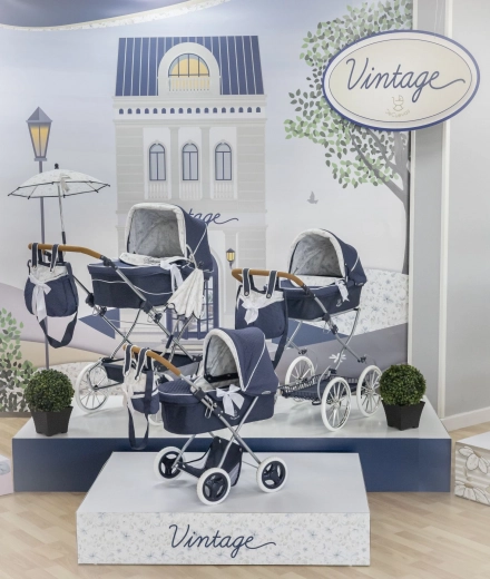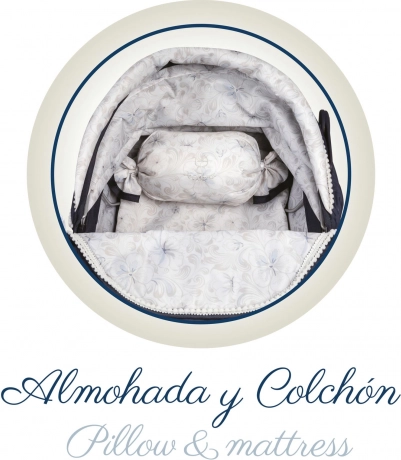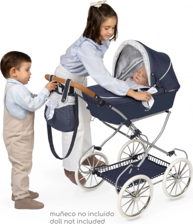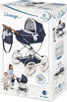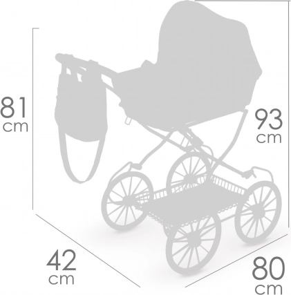 De wagen is inklapbaar, zeer gemakkelijk te bedienen en groeit mee met het kind dankzij 6 standen van de duwbeugel (52–81 cm). De praktische uitrusting omvat een doorgestikte cover voor de wieg met drukknoopjes, matras en kussentje, een ruime opbergmand en een design tas voor aan de wagen of over de schouder. Het precieze vakmanschap en Spaanse design maken het een geweldige keuze voor zowel spel als verzameling.