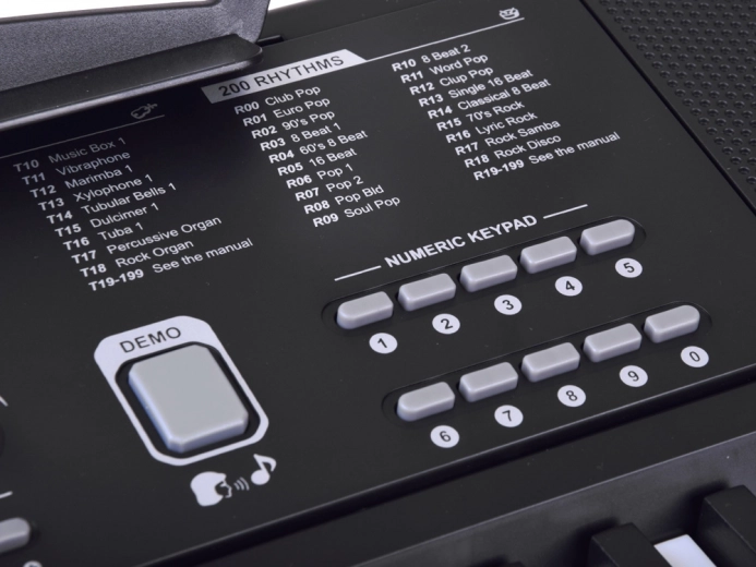 Je kunt kiezen uit 200 klanken (piano’s, orgels, strijkers, blazers en moderne synthesizers) en 200 begeleidingsstijlen van pop en rock tot jazz en disco. Er zijn 70 demo-nummers voor inspiratie en leren, de functie Record/Play voor het opnemen van je eigen ideeën en een Numeric Pad voor snelle numerieke invoer.