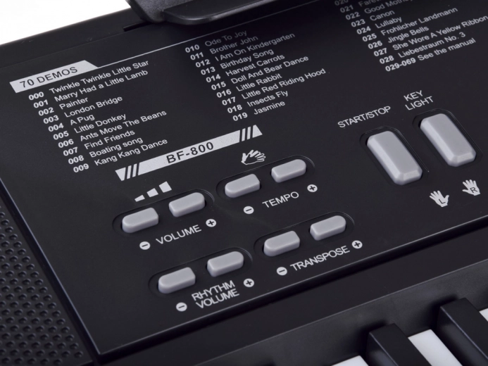 • Bediening: Start/Stop, Key Light, Volume, Tempo, Transpose, Record/Play, Demo