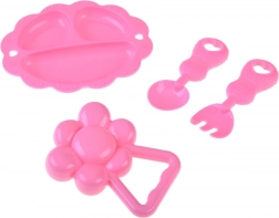 Een roze bordje, lepeltje, vorkje en rammelaar ondersteunen rollenspellen en stimuleren fantasie en motoriek.