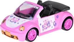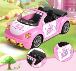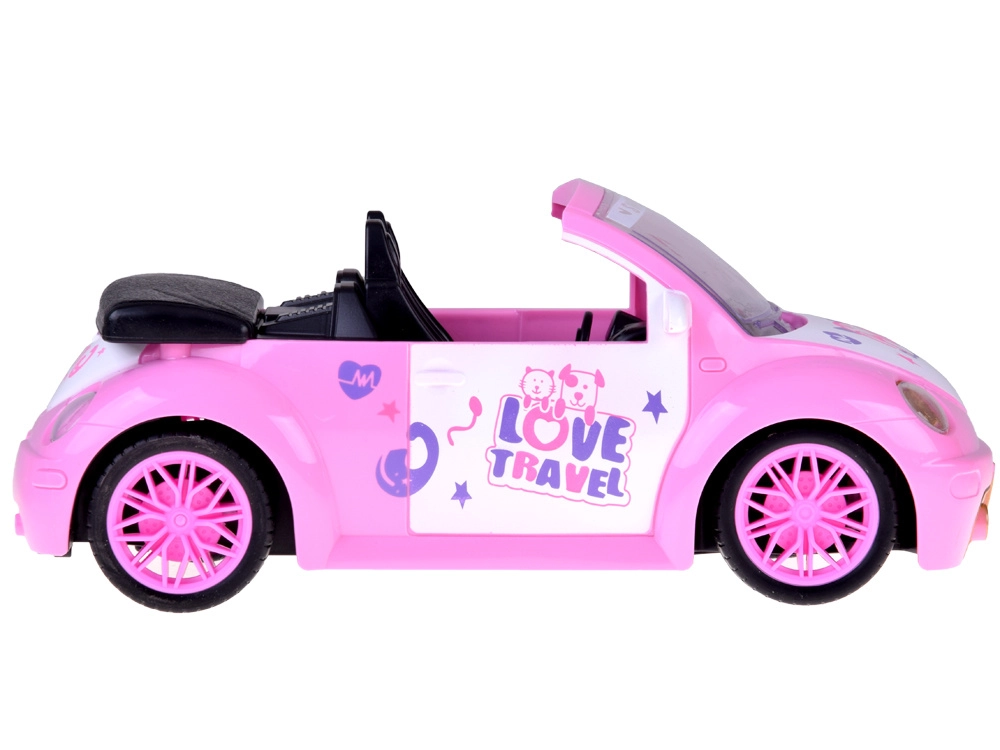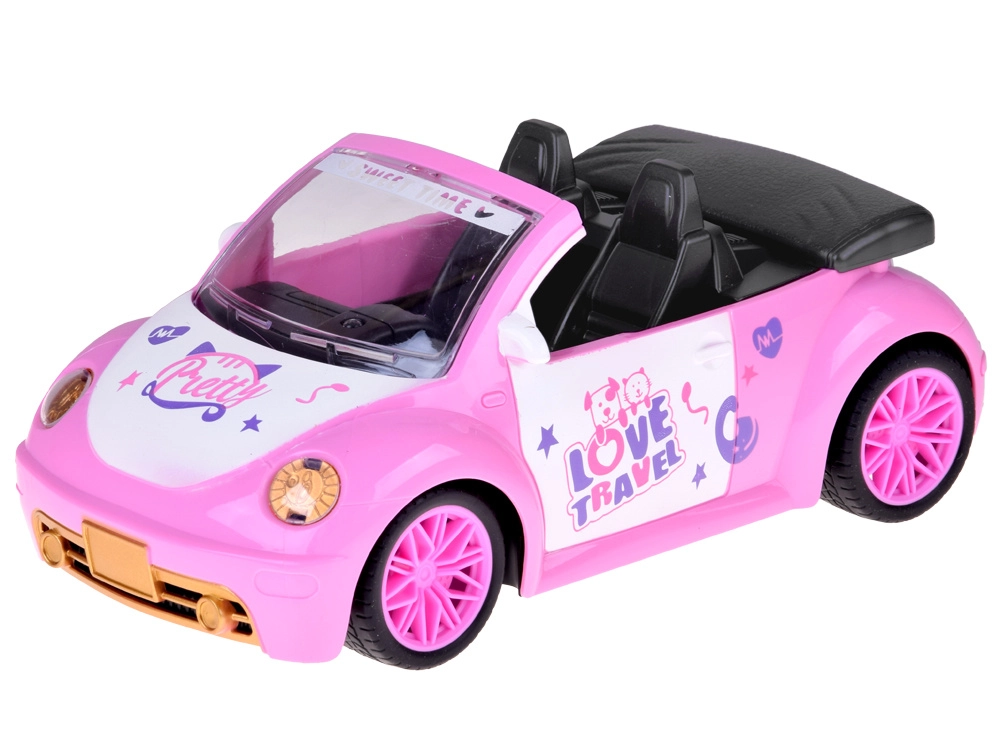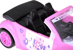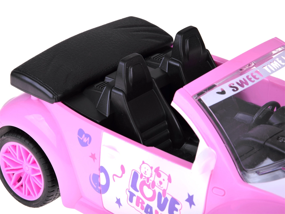 De open cabrio met gedetailleerd interieur en decoratieve stickers past perfect in de wereld van poppen en figuurtjes.