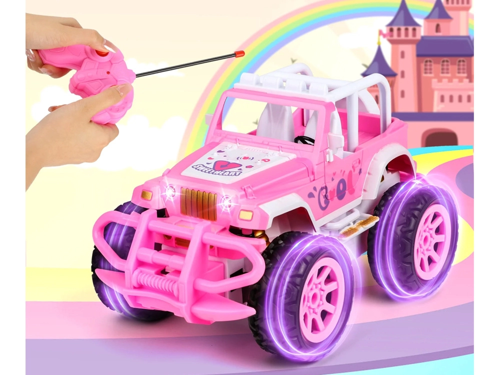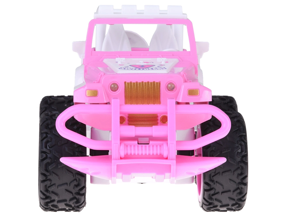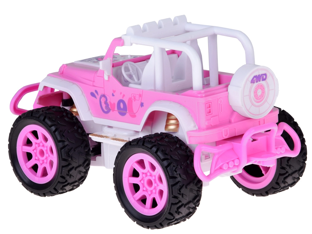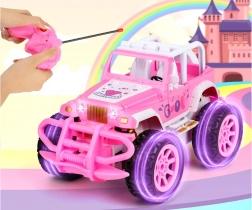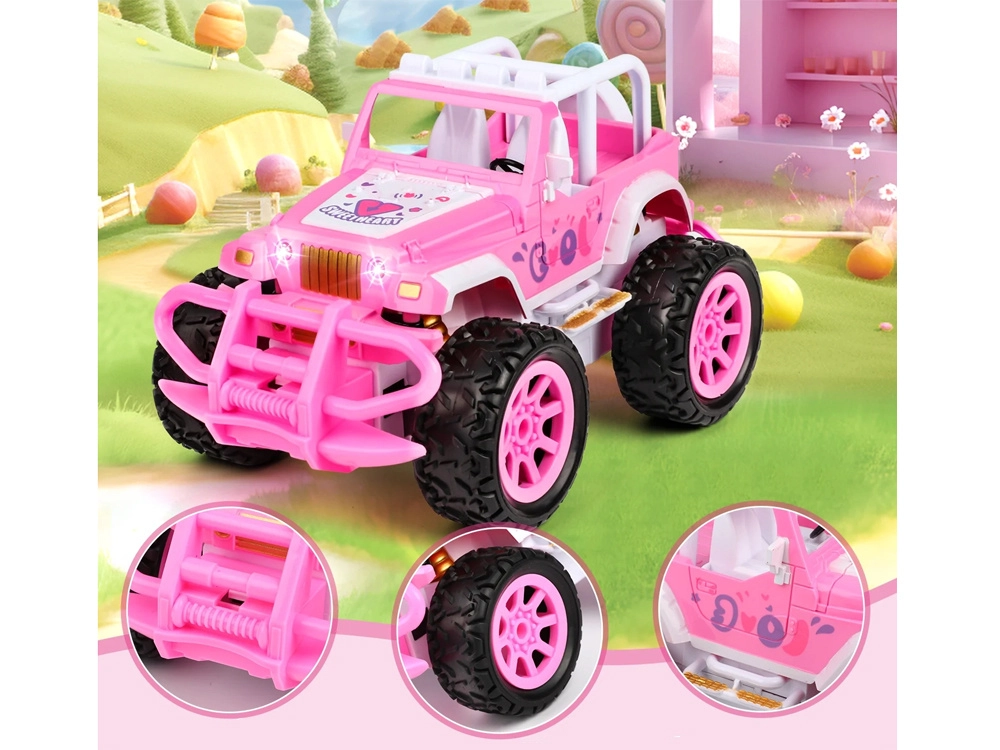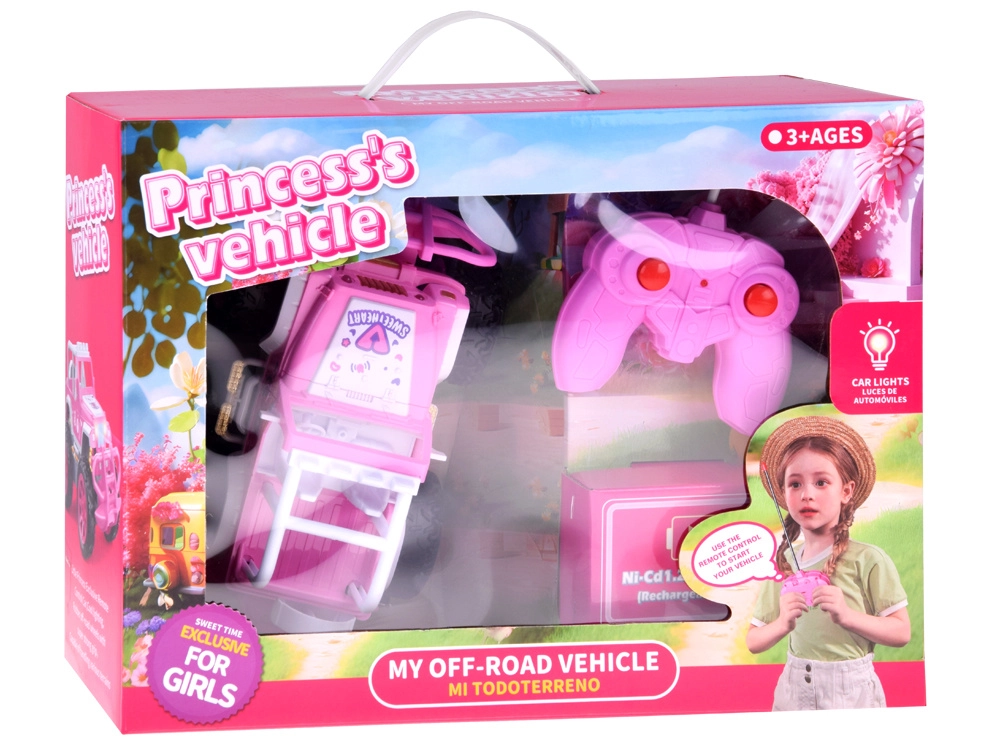Roze terrein RC-auto maakt alle kleine prinsesjes vanaf 3 jaar blij. Eenvoudige bediening met een gamepad-vormige controller, brandende koplampen en grote banden zorgen voor veel plezier en helpen bij de ontwikkeling van coördinatie en concentratie.