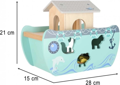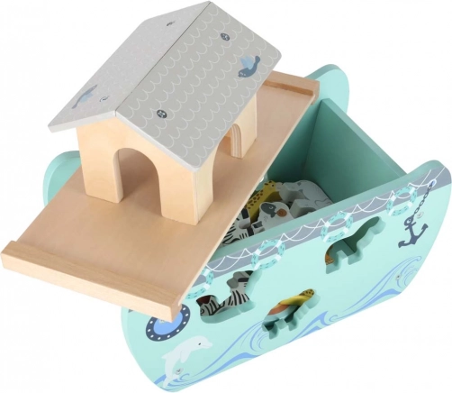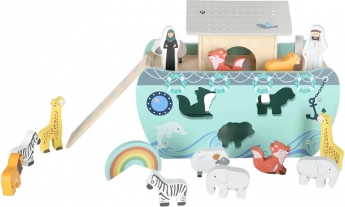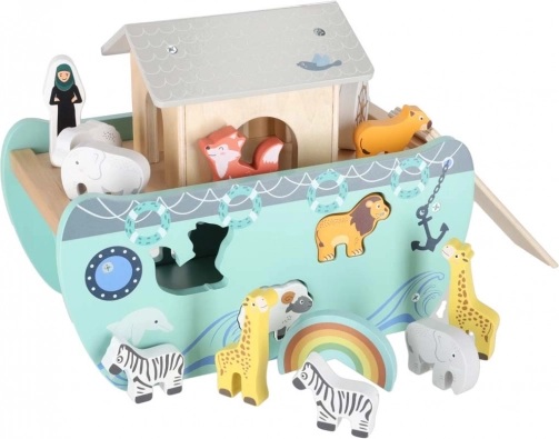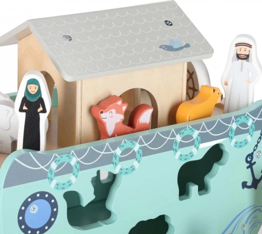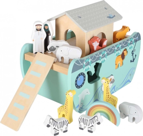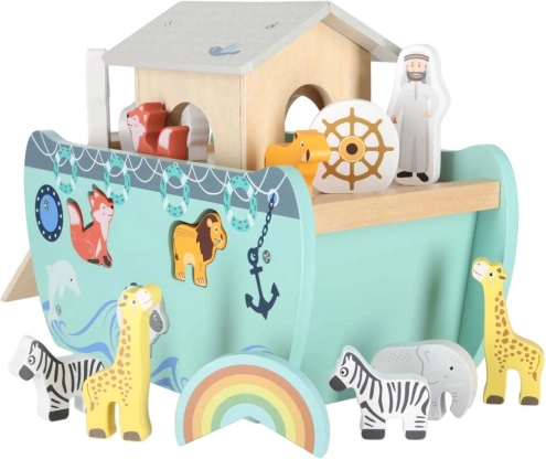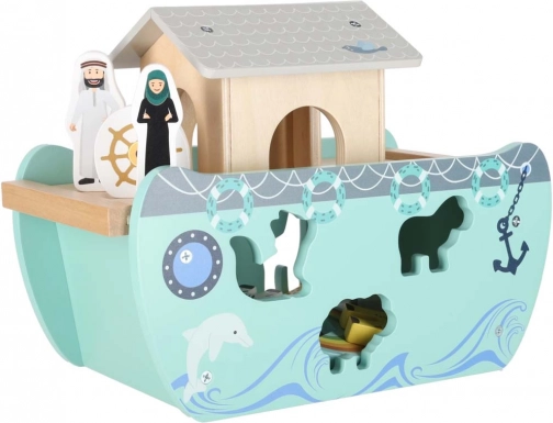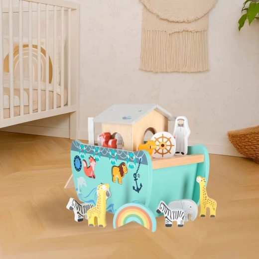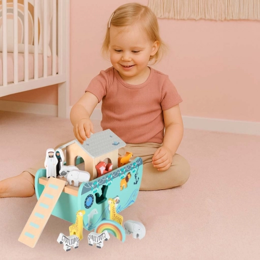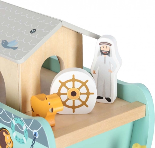 Ontdek een houten speelgoedset die een vormsorter, vrij spel en verhalen vertellen combineert. De ark met afneembare oprit en dak verbergt een set dierfiguren en twee figuren van Noach met zijn vrouw – kinderen kunnen de boot laden, sturen met het roer en de diertjes in de juiste openingen plaatsen.