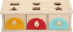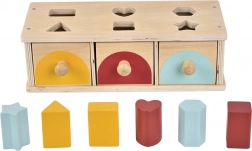 Na het correct plaatsen glijdt de vorm in het bijpassende, gekleurde laatje. Het kind ziet meteen het resultaat en begrijpt gemakkelijker het principe van oorzaak–gevolg.